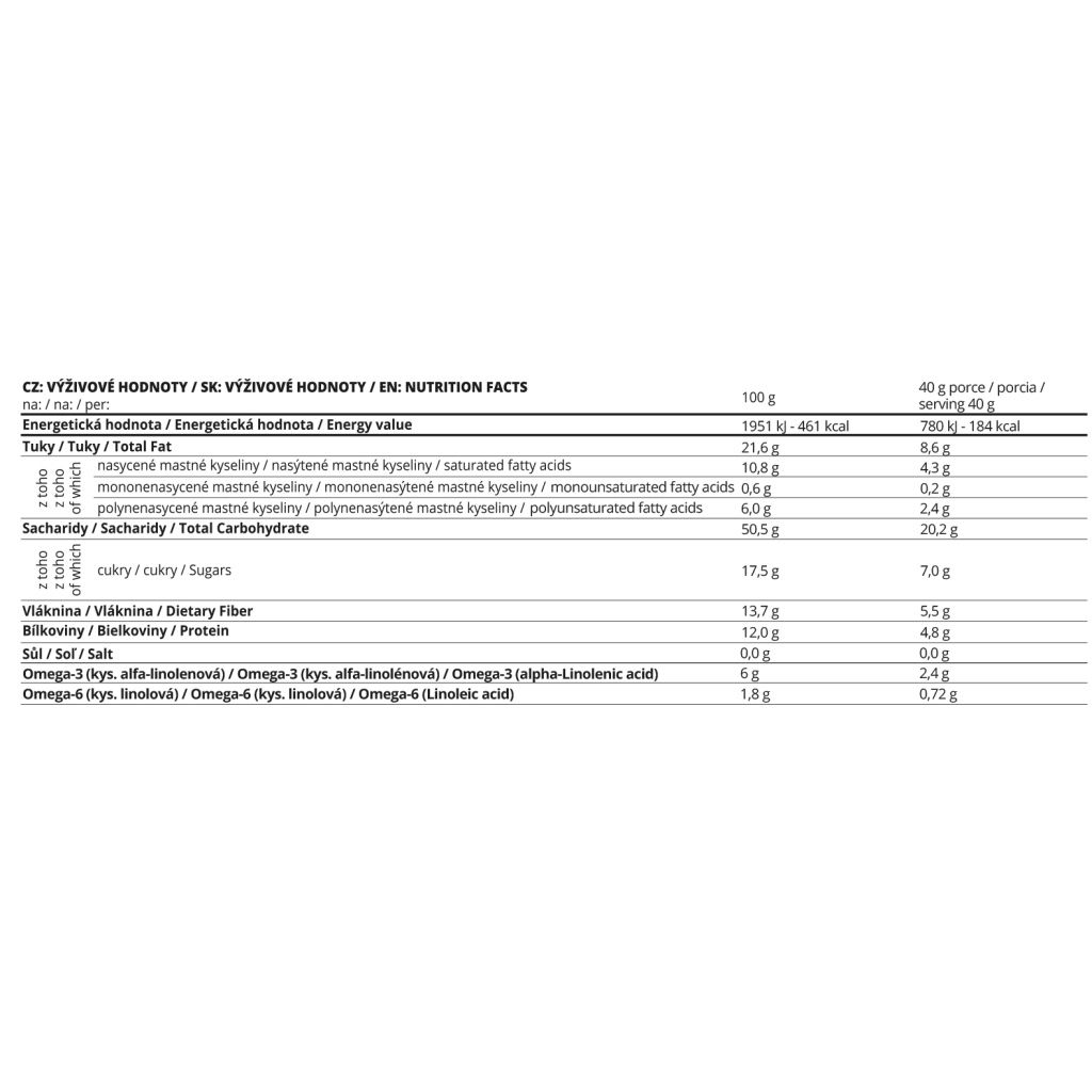 | Výživové hodnoty | Na 100 g | 1 porce (40 g) |
